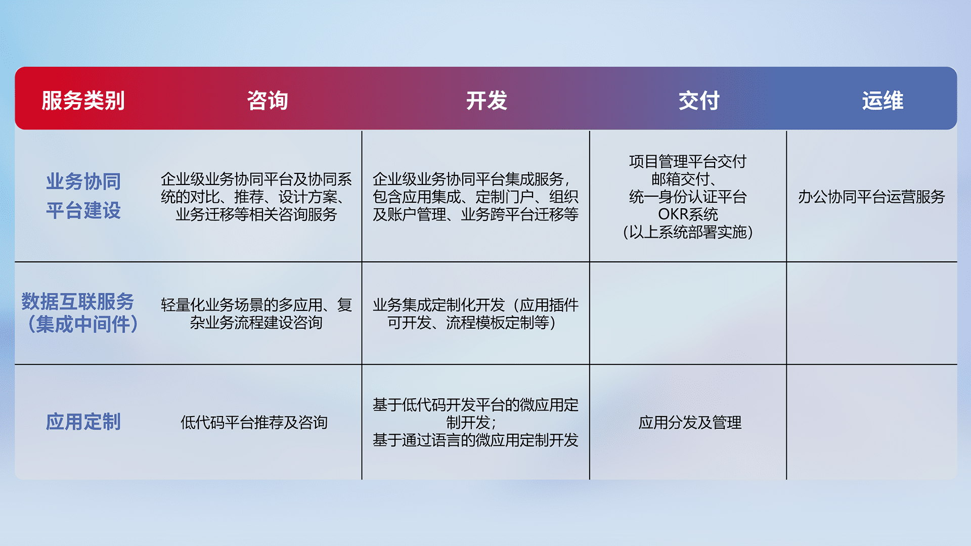 基于全代码低代码的数字化应用系统开发及交付,,满足特定业务场景的应用开发及集成,,提升企业业务信息化及数字化能力。。